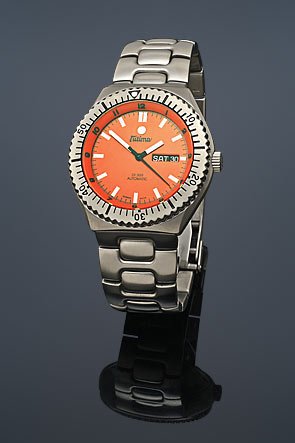 Tutima DI 300 42.5 mm Watch - Orange Dial, Titanium Bracelet 629-12 - For deeper dives, you need a clock to keep you on the right path all the way into the depths. The depression locks rotation bezel firmly in place a secure screw-down crown to you. Precise 1,000 meters below the surface And the telescope is designed to only turn on the left, so your dive time can be set to be extended reducednot involuntarily. Hands and markers against matte black or orange dial offer readability in dark or murky water, Tutima DI 300 42.5 mm Watch - Orange Dial, Titanium Bracelet 629-12.