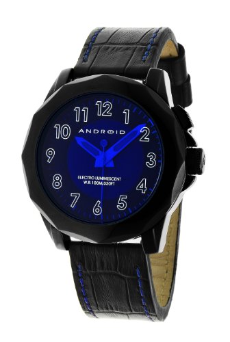 Android Unisex AD494ABU Euxine EL Edition Watch - The Euxine EL Edition is a statement of style and bold colors of Android. IP 50mm round black stainless steel case features a 12-sided bezel and matching push-pull crown and pushers one, which activates the light dial! 6N30 Miyota Japanese quartz movement covered a round dial with indices numbered variables colored under a mineral crystal, with different views of the floating figures. The time is marked by luminous hour, minute hands and seconds.The genuine lea, Android Unisex AD494ABU Euxine EL Edition Watch.