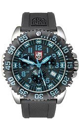 Luminox Steel Colormark Chronograph Men's watch #3183 - Diving watch, Precision Swiss quartz movement, chronograph with 12 hours, 30 minutes and continuous seconds counters, bright blue luminous hands accents and luminous center seconds, luminescent hands accented bright blue brand bright blue applied numerals Arabic numerals and blue luminescent index counter brand shiny blue markers and indices form surrounding blue track analogue 4 minute opening hours, two planes black dial with granulated texture, brushed ac, Luminox Steel Colormark Chronograph Men's watch #3183.