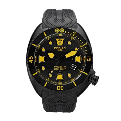 ZODIAC Oceanaire Automatic ZO8017 - Prepare yourself for your next adventure with this elegant automatic diving watch. A matte black IP stainless steel case and rubber strap occupy a central place in this sporty style. An anti-reflective sapphire crystal, a unidirectional rotating bezel with aluminum inlay and yellow Superluminova accents on polished stainless steel applied index complete the look. Two seahorses beautify case wrapped around an anchor and make the lifestyle of diving. Case size: 45 mm Lug Width: 24 mm Movement: Swiss Ma, ZODIAC Oceanaire Automatic ZO8017.
