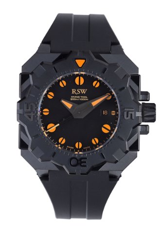 RSW Men's 7050.1.R1.18.00 Diving Tool Black Pvd Rotating Bezel Water Resistant Rubber Watch - This Mens Diving tool embodies the philosophy of the RSW, continue to create unique and extraordinary pieces and put his signature on the temple of eternal timekeepers. Join the elite circle of exclusive watches, the tool "diving" remains in its robustness and reliability the sports watch "par excellence". Strong sturdy and masculine black PVD steel case frames a black dial: orange luminescent hands and indexes, date display, minutes, RSW Men's 7050.1.R1.18.00 Diving Tool Black Pvd Rotating Bezel Water Resistant Rubber Watch.