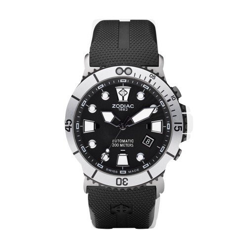 ZODIAC Oceanaire Automatic ZO8013 - Prepare yourself for your next adventure with this elegant automatic diving watch. A stainless steel case and black rubber strap that will take place in this sporty style. An anti-reflective sapphire crystal, a unidirectional rotating bezel with aluminum inlay and white Super-LumiNova accents on polished stainless steel applied index complete the look. Two seahorses beautify case wrapped around an anchor and make the lifestyle of diving. Case size: 45 mm Lug Width: 24 mm Movement: Swiss Made Automatic, ZODIAC Oceanaire Automatic ZO8013.