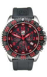 Luminox Steel Colormark Chronograph Men's watch #3195 - Diving watch, Precision Swiss quartz movement, chronograph with 12 hours, 30 minutes and continuous seconds counters, bright red needles with luminous accents and luminescent sweep second, fluorescent bright red accents hands trademark bright red figures red Arabic, Arabic numerals and indexes luminescent hands meter mark, shiny indices and indices are red track minutes opening analog 4 hours, two planes black dial with granulated texture, brushed accents, Luminox Steel Colormark Chronograph Men's watch #3195.