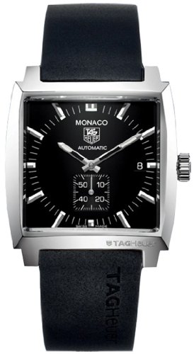 TAG Heuer Men's WW2110.FT6005 Monaco II Automatic Watch - With its eye-catching square case, automatic clock, the TAG Heuer Monaco men (model WW2110.FT6005) adds a touch of style to your wardrobe elegant. The stainless steel case measures 37.5 mm wide (1.47 inches) and is suitable for a sporty black rubber band. The black dial has luminous silver stick hour, minute, small bright points index rod hands, small second sitting 6 clock and date display at 3 clock. Other features include a basic anti-glare, TAG Heuer Men's WW2110.FT6005 Monaco II Automatic Watch.